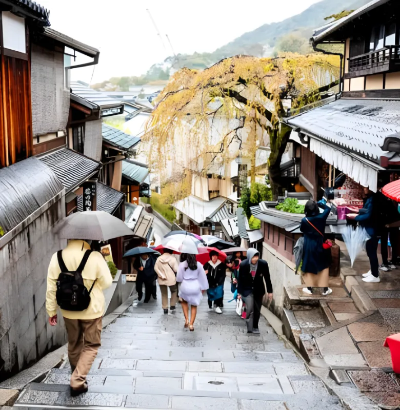 清水寺周辺の石畳の坂道は、雨に濡れると美しく輝き、江戸時代から続く街並みの情緒が一層引き立ちます。小さなお土産屋やカフェも並び、傘を片手にゆっくり散策するのもおすすめです。