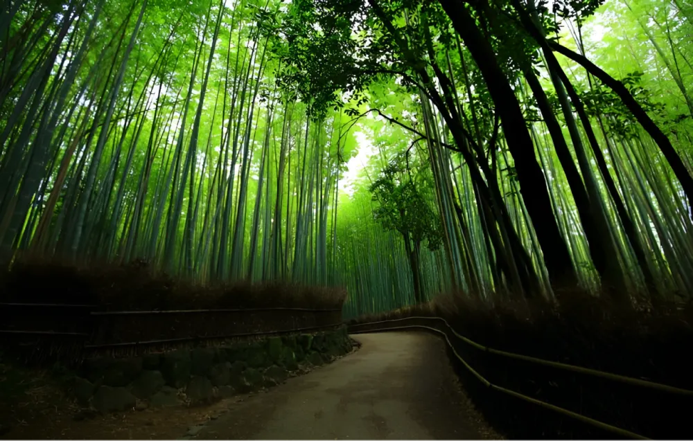 雨の日の渡月橋は霧や川のせせらぎと相まって、幻想的な風景が広がります。川面に映る橋や周囲の自然が静かに楽しめます。雨で人が少ないため、静かな竹林を歩くことができます。雨に濡れた竹が艶やかに輝き、特別な美しさがあります。